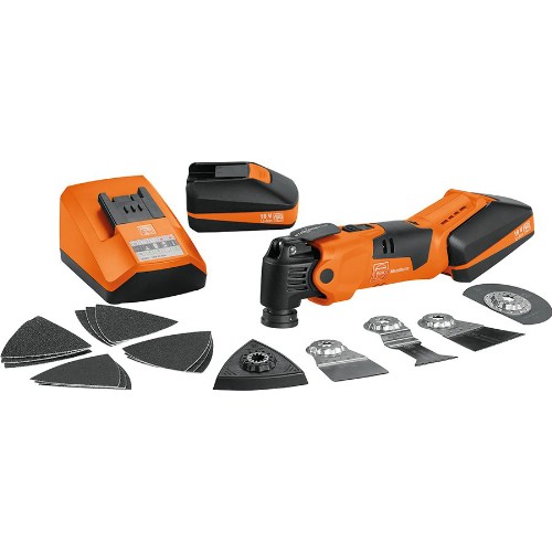 Standardutrustning: 2 st 4,0 Ah Li-Ion batterier, 1 st snabbladdare GAL 1880 CV, 2 st E-Cut standardsågblad curved (35 mm), 2 st E-Cut standardsågblad curved (65 mm), 1 st E-Cut Precision-sågblad (35 mm), 1 st E-Cut Precision-sågblad (65 mm), 1 st E-Cut Long-Life sågblad (10 mm), 2 st E-Cut Long-Life sågblad (35 mm), 1 st E-Cut Long-Life sågblad (32 mm), 1 st E-Cut Long-Life sågblad (42 mm), 1 st E-Cut Carbide Pro sågblad (32 mm), 1 st sågklinga segmenterad (Ø 85 mm), 1 st segmentsågklinga av hårdmetall, 1 st HM Rasp (trekantform), 1 st spackel, 1 st kniv med svampform, 1 st multikniv, 1 st slipplatta hålad, vardera 10 st slippapper hålade (K 60, 80, 120, 180), 1 st utsugningsanordning och staplingsbar förvaringsväska L-BOXX 136.