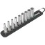 Hylssats i 9 delar. 6-kantshylsor med 1/4" infästning i långt utförande. Sexkantsprofil som möjliggör överföring av stor kraft. Tack vare hylsans långa utförande går det att nå även förskruvningar på trånga platser. Räffling i bakre änden för bättre grepp vid handskruvning. Industrikvalitet, tillverkad av krom-vanadinstål. Färgmarkering för lättare identifikation av storlek. Robust textilband med karbinhake för fastsättning i bälteshälla eller ficka, kardborreband på baksidan och praktisk hållarfunktion för hylsorna.