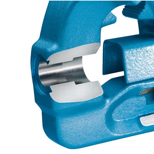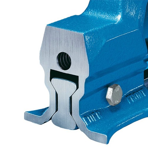 Kraftigt bänkskruvstycke av härdat stål. Helt smitt i stål garanterar att skruvstycket ej går att knäcka. Hög finish, hög precision och exakthet som ger tillförlitlighet och lång livslängd. Sänksmidda spänn- och rörspännbackar. Integrerat städ på baktill på skruvstycket. Slank och sänksmidd styrskena ger ett stort spänndjup. Dubbla inneliggande prismaföringen är skyddad från yttre påverkan. Lätt gång av ledskenan och glappfri inspänning. Spindelns konstruktion är kallvalsad som ger högre hållfasthet. Skyddad lagring av precisionsspindeln. Galvaniserad spindel med dubbel trapetsgänga. Justerbar centrisk styrning. Nitade säkerhetsringar vid spindelnyckeln.
