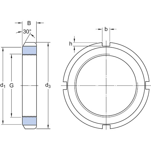 Låsmutter med metrisk gänga. Används för att fixera lager på en axel. Med fyra jämnt fördelade urtag runt omkretsen så att en skruvnyckel kan användas för montering. Muttern måste säkras med en låsbricka för att den inte ska lossna oavsiktligt. Enkel att montera och demontera.
