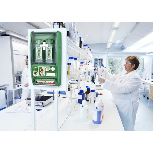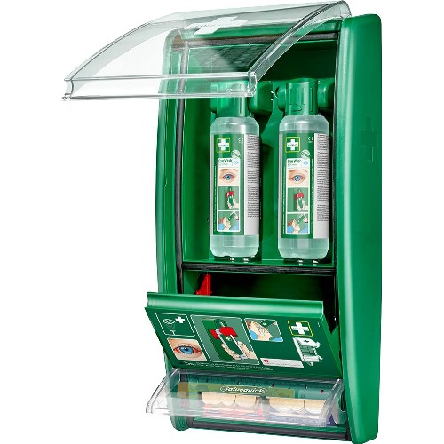 Station med ögondusch som är bevisat mer effektiv än koksaltlösning vid stänk från alkalier och syror. Ögonduschstationen är designad för att det ska gå fort att få hjälp. Innehåller 2 flaskor som öppnas automatiskt när de vrids ur hållarna. Flaskorna är utformade så att ögat sköljs med ett rikligt flöde i cirka 1,5 minut, ögonkopp som garanterar ett optimalt flöde. Buffrad vätska ökar chansen att rädda ögonen. Verkar för att neutralisera ögats pH-värde, dvs den har en neutraliserande effekt på stänk av alkalier och syror vilket ger snabbare resultat än en vanlig koksaltlösning. Effekten är generellt starkare på alkalier än syror. 4,5 års hållbarhetstid. Flaskorna kan ej återanvändas. Stationen är också utrustad med en plåsterautomat. Plåstren dras nedåt för att undvika att man att smutsar eller blöder ner övriga plåster. Plåsterrefillerna sitter fastlåsta i automaten för att säkerställa att de inte försvinner. De tomma refillerna lossas enkelt med en specialnyckel.