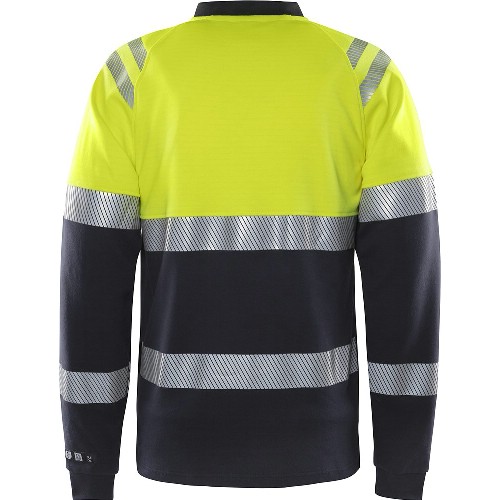 V-ringad t-shirt i varselfärg med lång ärm och skydd mot ljusbåge. Med multinorm, inherent (inbyggt) flamskydd. Ribbstickad halskant och ärmmudd. Raglanärm. Stretchreflexer. Tvätt 60°C.
