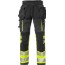 Varselbyxa i 4-vägs stretchmaterial. Slitstarkt ripstop-material med 4-vägs stretch på lår och baksida. Ribbstickat stretchparti i midjan. 2 löst hängande spikfickor i Cordura-stretch med dragkedja i ovankant, den ena med 3 mindre fickor och verktygshällor, den andra med extra ficka. D-ring under löst hängande ficka. 2 framfickor. Gummiklädd knapp. Dubbel förstärkt grensöm. Hammarhank. 2 bakfickor med dragkedja. 2 benfickor med dragkedja och ventilationsnät i öppningen. Tumstocksficka av Cordura med verktygsficka, pennficka samt knapp och hälla för kniv. Benficka med telefonficka i stretchmaterial. Knäfickor i Cordura-stretch med öppning inifrån. Knäskydden i knäfickorna kan höjdjusteras. Reglerbart Cordura-förstärkt benslut med tryckknappar.