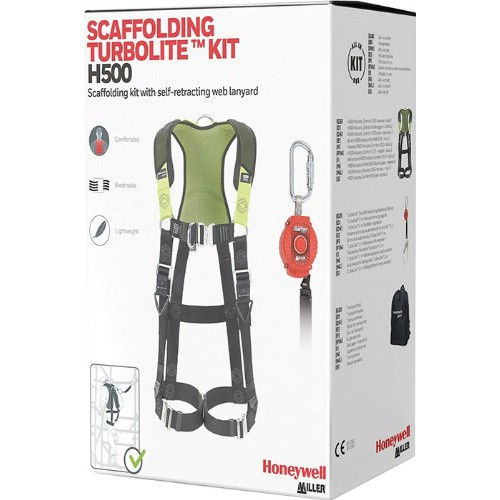 Komplett fallskyddspaket för ställningsarbeten. Består av fallskyddssele H500 IC6 H-design med stor rörelsefrihet. Lätt och smidig att ta av och på. Tryckavlastande vadderingar på axlar och rygg som minimerar trötthet och överansträngning i muskler. Hög andningsförmåga. Optimal komfort runt ben och axlar. Sidojusteringsremmar som ger extra bra passform. H-design för ben ger ökad användarkomfort. D-ring framtill och SRL-länk på ryggen för enkel anslutning av t.ex fallskyddsblock. Användarvänliga hållare gör det möjligt för användare att haka fast t.ex ställningskroken när man inte använder den. Tydligt identifierbara fallindikatorer för problemfri inspektion. Lättvikts Cobra-snabbspännen i aluminium. Inbäddad RFID-tagg för problemfri inspektion. Vattenavvisande band. Låg vikt. Godkänd för max 140 kg. Fallskyddsblock Turbolite 2 m med vävband och snabbverkande bromsmekanism. 1 st skruvkarbin med öppning 18 mm och 1 st ställningskrok med öppning 65 mm. Levereras med förvaringsväska.
