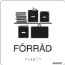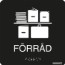 Skylt i hårdplast med 98% återvunnet material, med upphöjd punktskrift (taktil). Hög färgkontrast mellan bakgrund och text/punktskrift/symbol. Skylten är anpassad för utrymmen och lokaler där både seende och synskadade/synnedsatta vistas. Symbol för förråd, text "förråd" samt punktskrift.